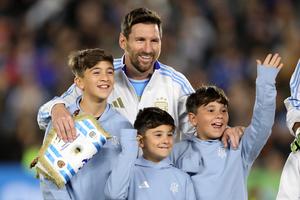 (250905) -- BUENOS AIRES, 5 septiembre, 2025 (Xinhua) -- Imagen del 4 de septiembre de 2025 del jugador Lionel Messi (atrás), de Argentina, reaccionando junto a sus hijos Thiago (i-frente), Mateo (d-frente) y Ciro (c-frente) durante el partido ante Venezuela correspondiente a las Eliminatorias Sudamericanas para el Mundial de Estados Unidos, México y Canadá 2026, celebrado en el Estadio Monumental, en la ciudad de Buenos Aires, capital de Argentina. (Xinhua/Martín Zabala) (mz) (rtg) (ra) (vf)