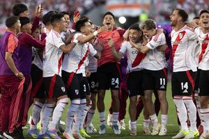 (250427) -- BUENOS AIRES, 27 abril, 2025 (Xinhua) -- Jugadores de River Plate festejan la victoria al término del partido correspondiente a la Jornada 15 del Torneo Apertura de la Liga Profesional, ante Boca Juniors, celebrado en el Estadio Antonio Vespucio Liberti, en la ciudad de Buenos Aires, capital de Argentina, el 27 de abril de 2025. (Xinhua/Martín Zabala) (mz) (rtg) (da)