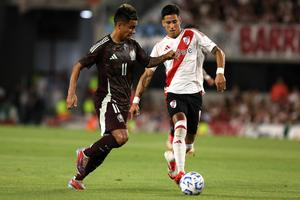 (250122) -- BUENOS AIRES, 22 enero, 2025 (Xinhua) -- Imagen del 21 de enero de 2025 del jugador Maximiliano Meza (d), de River Plate de Argentina, disputando el balón con Efraín Alvarez (i), de la selección de México, durante el partido amistoso celebrado en el Estadio Más Monumental, en la ciudad de Buenos Aires, capital de Argentina. (Xinhua/Martín Zabala) (mz) (ah) (ra) (ce)
