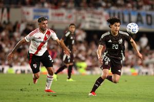 (250122) -- BUENOS AIRES, 22 enero, 2025 (Xinhua) -- Imagen del 21 de enero de 2025 del jugador Santiago Simón (i), de River Plate de Argentina, disputando el balón con Jeremy Márquez (d), de la selección de México, durante el partido amistoso celebrado en el Estadio Más Monumental, en la ciudad de Buenos Aires, capital de Argentina. (Xinhua/Martín Zabala) (mz) (ah) (ra) (ce)