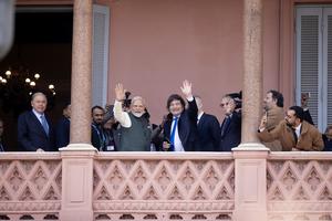 (250705) -- BUENOS AIRES, 5 julio, 2025 (Xinhua) -- El presidente argentino, Javier Milei (4-d), y el primer ministro indio, Narendra Modi (3-i), saludan desde un balcón al término de una reunión en la Casa Rosada, en la ciudad de Buenos Aires, capital de Argentina, el 5 de julio de 2025. Modi se reunió el sábado en la ciudad de Buenos Aires con Milei, con quien conversó sobre las posibilidades de diversificar los lazos y ampliar la cooperación bilateral. (Xinhua/Martín Zabala) (mz) (oa) (da)