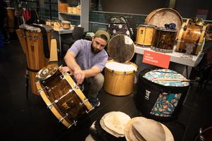 (250524) -- BUENOS AIRES, 24 mayo, 2025 (Xinhua) -- Imagen del 23 de mayo de 2025 de un luthier afinando el instrumento "bombo de murga porteña" en un estand durante un encuentro de fabricantes de instrumentos de percusión como parte del Festival internacional Toque 2025, en el Palacio Libertad, en la ciudad de Buenos Aires, capital de Argentina. Luthiers, artesanos sonoros y entusiastas de la percusión de distintas provincias de Argentina se dan cita desde el viernes en Buenos Aires en un encuentro de fabricantes de instrumentos de percusión que permite el intercambio, la difusión de sus creaciones y el fortalecimiento de vínculos entre quienes trabajan y disfrutan de este arte. (Xinhua/Martín Zabala) (mz) (oa) (da)