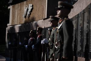 (250402) -- BUENOS AIRES, 2 abril, 2025 (Xinhua) -- Miembros de las distintas Fuerzas Armadas argentinas custodian el cenotafio durante un acto realizado frente al Monumento a los Caídos en Malvinas, al cumplirse 43 años del inicio de un conflicto bélico entre Argentina y el Reino Unido, en la ciudad de Buenos Aires, Argentina, el 2 de abril de 2025. El Gobierno argentino reafirmó el miércoles su "reclamo inclaudicable" en pos de recuperar la soberanía efectiva sobre las Islas Malvinas, un archipiélago ubicado en el sur del Océano Atlántico controlado desde 1833 por el Reino Unido, al cumplirse 43 años del inicio de un conflicto bélico entre ambas partes por el territorio insular. (Xinhua/Martín Zabala) (mz) (jg) (da) (ce)