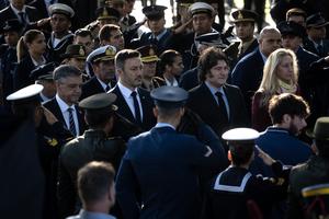 (250402) -- BUENOS AIRES, 2 abril, 2025 (Xinhua) -- El presidente argentino, Javier Milei (c-d), asiste a un acto realizado frente al Monumento a los Caídos en Malvinas, al cumplirse 43 años del inicio de un conflicto bélico entre Argentina y el Reino Unido, en la ciudad de Buenos Aires, Argentina, el 2 de abril de 2025. El Gobierno argentino reafirmó el miércoles su "reclamo inclaudicable" en pos de recuperar la soberanía efectiva sobre las Islas Malvinas, un archipiélago ubicado en el sur del Océano Atlántico controlado desde 1833 por el Reino Unido, al cumplirse 43 años del inicio de un conflicto bélico entre ambas partes por el territorio insular. (Xinhua/Martín Zabala) (mz) (jg) (da) (ce)