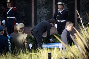 (250402) -- BUENOS AIRES, 2 abril, 2025 (Xinhua) -- El presidente argentino, Javier Milei (c), deposita una ofrenda floral durante un acto realizado frente al Monumento a los Caídos en Malvinas, al cumplirse 43 años del inicio de un conflicto bélico entre Argentina y el Reino Unido, en la ciudad de Buenos Aires, Argentina, el 2 de abril de 2025. El Gobierno argentino reafirmó el miércoles su "reclamo inclaudicable" en pos de recuperar la soberanía efectiva sobre las Islas Malvinas, un archipiélago ubicado en el sur del Océano Atlántico controlado desde 1833 por el Reino Unido, al cumplirse 43 años del inicio de un conflicto bélico entre ambas partes por el territorio insular. (Xinhua/Martín Zabala) (mz) (jg) (da) (ce)