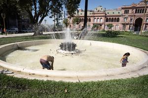 (250305) -- BUENOS AIRES, 5 marzo, 2025 (Xinhua) -- Un hombre se refresca junto a su hija en una de las fuentes de la Plaza de Mayo frente a la Casa Rosada durante una ola de calor, en la ciudad de Buenos Aires, capital de Argentina, el 5 de marzo de 2025. Argentina se encuentra nuevamente bajo una ola de calor que afecta a 10 de los 24 distritos en que se divide el país, de acuerdo con datos del Servicio Meteorológico Nacional. (Xinhua/Martín Zabala) (mz) (da) (ra) (ce)