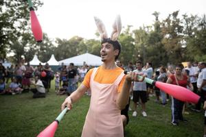 (260404) -- BUENOS AIRES, 4 abril, 2026 (Xinhua) -- Imagen del 3 de abril de 2026 de un artista realizando malabares en el Paseo de Pascuas en la Plaza Sicilia, en la ciudad de Buenos Aires, capital de Argentina. La capital de Argentina, Buenos Aires, celebra las Pascuas con propuestas para toda la familia y múltiples actividades en distintos barrios porteños. (Xinhua/Martín Zabala) (mz) (oa) (da)