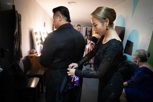 (250905) -- BUENOS AIRES, 5 septiembre, 2025 (Xinhua) -- Imagen del 27 de agosto de 2025 de Su Junqiang (i), y Guo Xingzhu, preparándose previo a los cuartos de final de la categoría Tango de Pista, en el Campeonato Mundial de Tango, en Buenos Aires, Argentina. En Buenos Aires, los bailarines de tango chinos Su Junqiang y Guo Xingzhu llevaron su pasión y dedicación al escenario mundial. La pareja, que ganó la competición regional de China en Shanghai a principios de este año, representó a China en el Campeonato Mundial de Tango 2025, avanzando a los cuartos de final y a las semifinales en la categoría "Tango de Pista" y realizando una presentación en la Milonga de Campeones. (Xinhua/Martín Zabala) (oa) (ra) (ce)