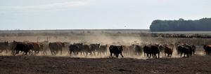(250516) -- TRENQUE LAUQUEN, 16 mayo, 2025 (Xinhua) -- Imagen del 14 de mayo de 2025 de bueyes corriendo en una granja, en la Estepa Pampeana, Argentina. (Xinhua/Meng Dingbo) (oa) (da) (vf)