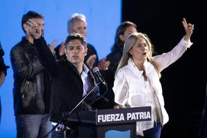 (251027) -- LA PLATA, 27 octubre, 2025 (Xinhua) -- Imagen del 26 de octubre de 2025 del gobernador de la provincia de Buenos Aires, Axel Kicillof (i), reaccionando en el búnker de campaña del partido Fuerza Patria al término de las elecciones legislativas de medio término, en la ciudad de La Plata, Argentina. El presidente de Argentina, Javier Milei, celebró el domingo el triunfo de su partido, La Libertad Avanza, en las elecciones legislativas de medio término, y prometió el desarrollo de un "camino reformista para consolidar el crecimiento y el despegue definitivo" del país sudamericano. (Xinhua/Martín Zabala) (mz) (oa) (ah) (ce)