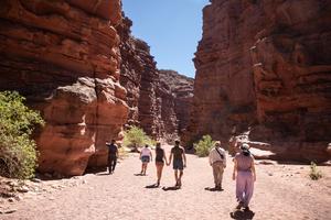 (251014) -- LA RIOJA, 14 octubre, 2025 (Xinhua) -- Imagen del 11 de octubre de 2025 de visitantes observando las formaciones rocosas del Cañón de Talampaya en el Parque Nacional Talampaya, en la provincia de La Rioja, Argentina. El Parque Nacional Talampaya, con una superficie de 215.000 hectáreas, está inscrito en la Lista del Patrimonio Mundial de la UNESCO. (Xinhua/Martín Zabala) (oa) (ah) (vf)