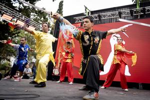 (250504) — LUJAN, 4 mayo, 2025 (Xinhua) — Alumnos del Club Argentino de Wushu realizan una presentación durante el festival «China en Luján», en la ciudad de Luján, Argentina, el 4 de mayo de 2025. La cultura china con su música típica, danza tradicional, rica gastronomía y legendarias artes marciales fue el eje del colorido festival realizado el domingo en la ciudad argentina de Luján, a 73 kilómetros al oeste de la capital Buenos Aires, marco en el que residentes y visitantes resultaron cautivados con los distintos pliegues de la civilización milenaria. (Xinhua/Martín Zabala) (mz) (rtg) (da)