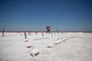 (260112) -- MACACHIN, 12 enero, 2026 (Xinhua) -- Imagen del 11 de enero de 2026 de una mujer saltando en uno de los sectores de las Salinas Grandes de Hidalgo, en la localidad de Macachín, en la provincia de La Pampa, Argentina. (Xinhua/Martín Zabala) (mz) (ah) (oa) (vf)