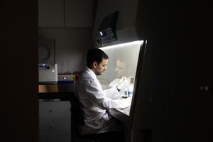 (250502) -- PILAR, 2 mayo, 2025 (Xinhua) -- Imagen del 24 de abril de 2025 del biólogo molecular Juan Ignacio Bastón cambiando de medio a cultivos de biopsias de dermis en una cabina de flujo laminar en el laboratorio de embriología de la empresa argentina Kheiron Biotech, en la ciudad de Pilar, Argentina. La clonación y la edición genómica amplían las fronteras del potencial deportivo de ejemplares equinos en Argentina, lo que no solo impulsa mejoras generacionales de caballos vinculados a ámbitos como el polo, sino que también potencia las exportaciones del sector biotecnológico del país, según expertos en la materia. (Xinhua/Martín Zabala) (mz) (oa) (ra) (vf)