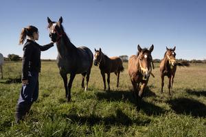 (250502) -- SAN ANTONIO DE ARECO, 2 mayo, 2025 (Xinhua) -- Imagen del 28 de abril de 2025 de la médica veterinaria Lucía Lupacchini (i) controlando ejemplares equinos clonados y editados genéticamente junto a una yegua portadora o receptora (2-i) en el sector de neonatología de la empresa argentina Kheiron Biotech en un campo, en la ciudad de San Antonio de Areco, Argentina. La clonación y la edición genómica amplían las fronteras del potencial deportivo de ejemplares equinos en Argentina, lo que no solo impulsa mejoras generacionales de caballos vinculados a ámbitos como el polo, sino que también potencia las exportaciones del sector biotecnológico del país, según expertos en la materia. (Xinhua/Martín Zabala) (mz) (oa) (ra) (vf)