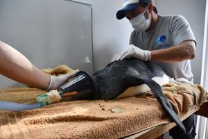 (250413) -- SAN CLEMENTE DEL TUYU, 13 abril, 2025 (Xinhua) -- Imagen proveída por la Fundación Mundo Marino del 13 de septiembre de 2024 de trabajadores de la Fundación Mundo Marino atendiendo a un ejemplar de pingüino rey (Aptenodytes patagonicus) rescatado de las playas de Mar del Tuyú, en San Clemente de Tuyu, Argentina. Una fundación ecológica trabaja todos los días en Argentina desde 1987 para el rescate y la rehabilitación de fauna silvestre, una noble tarea que como capítulo más reciente involucró a un pingüino rey que volvió al mar, luego de completar más de seis meses de rehabilitación. (Xinhua/Fundación Mundo Marino) (mz) (oa) (vf)