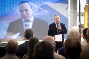 (251214) -- TIMBUES, 14 diciembre, 2025 (Xinhua) -- Imagen del 13 de diciembre de 2025 del embajador de China en Argentina, Wang Wei, hablando durante una ceremonia para la puesta en marcha del primer embarque comercial a granel de trigo argentino con destino a China en la terminal portuaria de Cofco International, en la localidad de Timbúes, en el norte de Rosario, en la provincia de Santa Fé, Argentina. El primer embarque comercial a granel de trigo argentino con destino a China partió el sábado desde la provincia argentina de Santa Fe, marcando un hito en la relación económica bilateral y la apertura de un nuevo flujo de comercio entre ambos países. (Xinhua/Martín Zabala) (mz) (oa) (da)