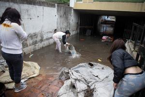 (251025) -- VILLA MAIPU, 25 octubre, 2025 (Xinhua) -- Mujeres intentan retirar el agua acumulada en su vivienda tras un temporal, en la localidad de Villa Maipú, Argentina, el 25 de octubre de 2025. (Xinhua/Martín Zabala) (mz) (oa) (da)