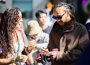(250314) — MELBOURNE, 14 marzo, 2025 (Xinhua) — El piloto británico de la escudería Ferrari, Lewis Hamilton (d), firma autógrafos para aficionados previo a la sesión de prácticas del Gran Premio de Australia de Fórmula Uno, en Albert Park, en Melbourne, Australia, el 14 de marzo de 2025. (Xinhua/Hu Jingchen) (rtg) (ra) (vf)