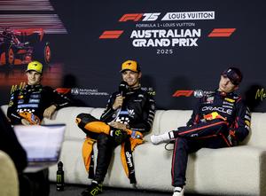(250315) -- MELBOURNE, 15 marzo, 2025 (Xinhua) -- El piloto británico de la escudería McLaren, Lando Norris (c), el piloto australiano de la escudería McLaren, Oscar Piastri (i), y el piloto neerlandés de la escudería Red Bull, Max Verstappen, asisten a la conferencia de prensa después de la sesión de clasificación del Gran Premio de Australia de Fórmula Uno, en Albert Park, en Melbourne, Australia, el 15 de marzo de 2025. (Xinhua/Ma Ping) (rtg) (da)