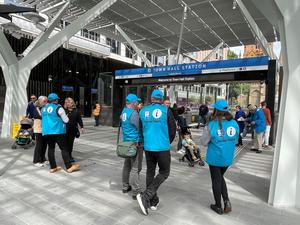 (251130) -- MELBOURNE, 30 noviembre, 2025 (Xinhua) -- Imagen tomada con un dispositivo móvil de empleados del Metro Tunnel esperando en la entrada de la Estación del Ayuntamiento para ayudar a los pasajeros, en Melbourne, Australia, el 30 de noviembre de 2025. El nuevo Metro Tunnel de Melbourne abrió por primera vez para los pasajeros el domingo después de años de construcción, marcando una mayor expansión de la red ferroviaria de la ciudad. Los servicios limitados a través de los túneles gemelos de nueve kilómetros y cinco nuevas estaciones bajo el distrito financiero de Melbourne comenzaron a operar el domingo por la mañana, y algunos pasajeros hicieron fila durante horas para abordar los primeros trenes. (Xinhua/Xu Haijing) (rtg) (da)