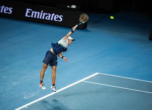 (250122) — MELBOURNE, 22 enero, 2025 (Xinhua) — Alex de Minaur sirve la pelota durante los cuartos de final de individuales masculinos entre Jannik Sinner, de Italia, y Alex de Minaur, de Australia, en el torneo de tenis Abierto de Australia, en Melbourne, Australia, el 22 de enero de 2025. (Xinhua/Hu Jingchen) (ah) (ra) (ce)