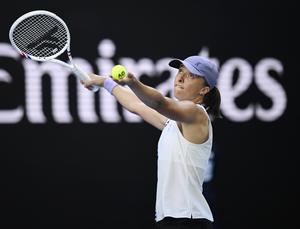 (260122) -- MELBOURNE, 22 enero, 2026 (Xinhua) -- Iga Swiatek, de Polonia, sirve la pelota durante el partido de segunda ronda de individuales femeninos entre Marie Bouzkova, de República Checa, en el torneo de tenis Abierto de Australia, en Melbourne, Australia, el 22 de enero de 2026. (Xinhua/Wang Shen) (da) (ra) (vf)