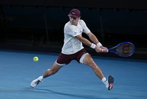 (260127) -- MELBOURNE, 27 enero, 2026 (Xinhua) -- Alex de Minaur devuelve la pelota durante el partido de cuartos de final de individuales masculinos entre Carlos Alcaraz, de España, y Alex de Minaur, de Australia, en el torneo de tenis Abierto de Australia, en Melbourne, Australia, el 27 de enero de 2026. (Xinhua/Wang Shen) (oa) (ah) (vf)