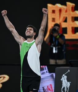 (260127) -- MELBOURNE, 27 enero, 2026 (Xinhua) -- Carlos Alcaraz festeja después de ganar el partido de cuartos de final de individuales masculinos entre Carlos Alcaraz, de España, y Alex de Minaur, de Australia, en el torneo de tenis Abierto de Australia, en Melbourne, Australia, el 27 de enero de 2026. (Xinhua/Wang Shen) (oa) (ah) (vf)