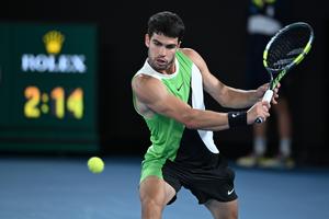 (260127) -- MELBOURNE, 27 enero, 2026 (Xinhua) -- Carlos Alcaraz devuelve la pelota durante el partido de cuartos de final de individuales masculinos entre Carlos Alcaraz, de España, y Alex de Minaur, de Australia, en el torneo de tenis Abierto de Australia, en Melbourne, Australia, el 27 de enero de 2026. (Xinhua/Wang Shen) (oa) (ah) (vf)