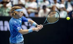 (260119) -- MELBOURNE, 19 enero, 2026 (Xinhua) -- Andrey Rublev, de Rusia, devuelve la pelota durante el partido de primera ronda de individuales masculinos, ante Matteo Arnaldi, de Italia, en el torneo de tenis Abierto de Australia, en Melbourne, Australia, el 19 de enero de 2026. (Xinhua/Hu Jingchen) (rtg) (ah) (vf)
