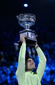 (260201) -- MELBOURNE, 1 febrero, 2026 (Xinhua) -- Carlos Alcaraz festeja con el trofeo después de ganar el partido final de individuales masculinos entre Carlos Alcaraz, de España, y Novak Djokovic, de Serbia, en el torneo de tenis Abierto de Australia, en Melbourne, Australia, el 1 de febrero de 2026. (Xinhua/Wang Shen) (rtg) (ah)