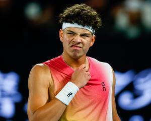 (250124) -- MELBOURNE, 24 enero, 2025 (Xinhua) -- Ben Shelton reacciona durante las semifinales de individuales masculinos entre Jannik Sinner, de Italia, y Ben Shelton, de Estados Unidos, en el torneo de tenis Abierto de Australia, en Melbourne, Australia, el 24 de enero de 2025. (Xinhua/Chu Chen) (oa) (ra) (ce)