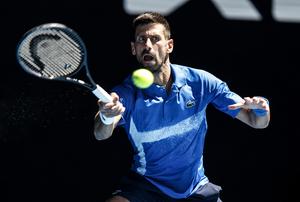 (250124) -- MELBOURNE, 24 enero, 2025 (Xinhua) -- Novak Djokovic devuelve la pelota durante las semifinales de individuales masculinos entre Novak Djokovic, de Serbia, y Alexander Zverev, de Alemania, en el torneo de tenis Abierto de Australia, en Melbourne, Australia, el 24 de enero de 2025. (Xinhua/Ma Ping) (oa) (ra) (vf)