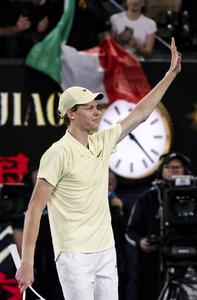 (250124) -- MELBOURNE, 24 enero, 2025 (Xinhua) -- Jannik Sinner festeja la victoria en las semifinales de individuales masculinos entre Jannik Sinner, de Italia, y Ben Shelton, de Estados Unidos, en el torneo de tenis Abierto de Australia, en Melbourne, Australia, el 24 de enero de 2025. (Xinhua/Ma Ping) (oa) (ra) (ce)