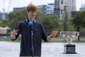 (250127) -- MELBOURNE, 27 enero, 2025 (Xinhua) -- Jannik Sinner, de Italia, habla durante la sesión fotográfica del ganador del torneo de tenis Abierto de Australia en el lago Albert Park, en Melbourne, Australia, el 27 de enero de 2025. (Xinhua/Chu Chen) (oa) (ah) (vf)