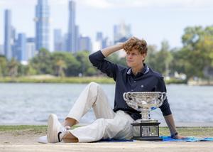 (250127) -- MELBOURNE, 27 enero, 2025 (Xinhua) -- Jannik Sinner, de Italia, posa con el trofeo durante la sesión fotográfica del ganador del torneo de tenis Abierto de Australia en el lago Albert Park, en Melbourne, Australia, el 27 de enero de 2025. (Xinhua/Chu Chen) (oa) (ah) (vf)