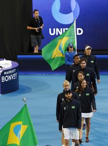 (241227) -- PERTH, 27 diciembre, 2024 (Xinhua) -- Miembros del equipo de Brasil entran en la cancha previo al partido de round-robin (todos contra todos) del Grupo E entre China y Brasil en el torneo de tenis United Cup 2025, en Perth, Australia, el 27 de diciembre de 2024. (Xinhua/Ma Ping) (oa) (ra) (vf)