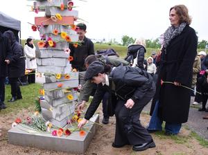 (250507) -- VIENA, 7 mayo, 2025 (Xinhua) -- Imagen del 5 de mayo de 2025 de personas colocando flores en un nuevo monumento del Memorial del Campo de Concentración de Mauthausen, en la Alta Austria, Austria. El campo de concentración de Mauthausen fue el primer campo de concentración establecido en un país extranjero por la Alemania nazi. (Xinhua/He Canling) (ah) (ra) (ce)