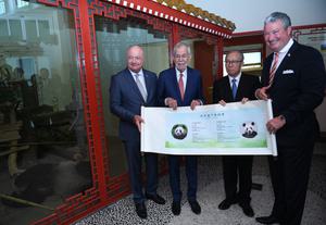 (250515) — VIENA, 15 mayo, 2025 (Xinhua) — Li Hongzhong (2-d), miembro del Buró Político del Comité Central del Partido Comunista de China y vicepresidente del Comité Permanente de la Asamblea Popular Nacional (APN), el presidente de Austria, Alexander Van der Bellen (2-i), y el canciller, Christian Stocker (i), asisten a la ceremonia de bienvenida por la llegada de una nueva pareja de pandas gigantes a Austria, en Viena, Austria, el 14 de mayo de 2025. Una delegación china encabezada por Li Hongzhong, vicepresidente del Comité Permanente de la APN, visitó Austria del domingo al miércoles. (Xinhua/He Canling) (jg) (ah) (ce)