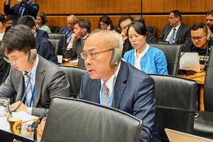 (250910) -- VIENA, 10 septiembre, 2025 (Xinhua) -- Li Song, representante permanente de China ante el Organismo Internacional de Energía Atómica (OIEA), hace comentarios en la reunión de la Junta de Gobernadores del OIEA, en Viena, Austria, el 10 de septiembre de 2025. China se opone de forma explícita a la decisión de Francia, Reino Unido y Alemania (E3) de utilizar el mecanismo de restablecimiento automático (snapback) para reactivar las sanciones contra Irán y pide realizar más esfuerzos diplomáticos en la cuestión nuclear iraní, dijo el miércoles Li Song. (Xinhua/Misión Permanente de China ante la ONU y otras Organizaciones Internacionales en Viena) (jg) (da) (ce)