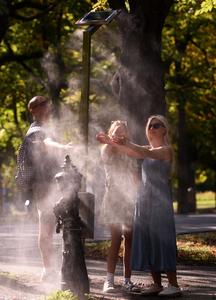 (250814) -- VIENA, 14 agosto, 2025 (Xinhua) -- Personas se refrescan en un sistema de enfriamiento por rocío en medio de una ola de calor, en Viena, Austria, el 14 de agosto de 2025. (Xinhua/He Canling) (rtg) (ra) (vf)