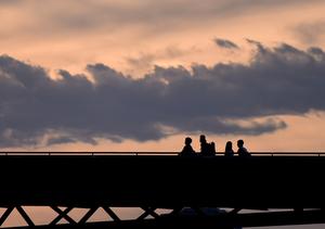 (250821) -- VIENA, 21 agosto, 2025 (Xinhua) -- Imagen del 20 de agosto de 2025 de personas caminando en un puente sobre el río Danubio al atardecer, en Viena, Austria. (Xinhua/He Canling) (da) (ra) (vf)