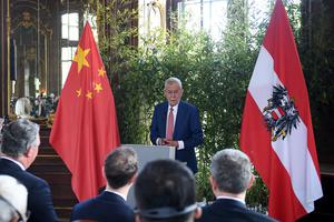 (250515) — VIENA, 15 mayo, 2025 (Xinhua) — Imagen del 14 de mayo de 2025 del presidente austriaco, Alexander Van der Bellen, hablando durante una ceremonia de bienvenida para la llegada de una nueva pareja de pandas gigantes de China en el Zoológico de Schoenbrunn, en Viena, Austria. El miércoles se celebró aquí una ceremonia de bienvenida para la llegada de una nueva pareja de pandas gigantes de la provincia de Sichuan, suroeste de China. Los pandas, el macho He Feng y la hembra Lan Yun, nacieron en 2020. Llegaron al Zoológico de Schoenbrunn de Viena el 23 de abril para una estadía de una década como símbolos de la amistad entre China y Austria. De acuerdo con el Centro para la Conservación y la Investigación del Panda Gigante de China, He Feng es enérgico y Lan Yun es conocida por su naturaleza gentil. Sus nombres hacen referencia a la frescura de las flores de loto y la fragancia de las orquídeas, lo que refleja el simbolismo tradicional chino. (Xinhua/He Canling) (da) (ra) (vf)