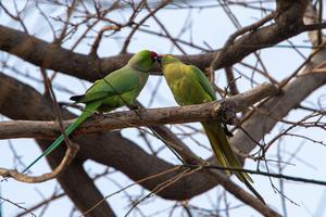 (260317) -- BAKU, 17 marzo, 2026 (Xinhua) -- Imagen del 16 de marzo de 2026 de cotorras de Kramer posándose sobre la rama de un árbol en el Bulevar Costero, en Bakú, Azerbaiyán. (Xinhua/Chen Junfeng) (jg) (ra) (ce)