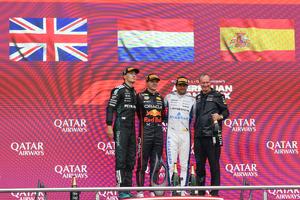 (250922) -- BAKU, 22 septiembre, 2025 (Xinhua) -- Imagen del 21 de septiembre de 2025 del ganador de la carrera, el piloto neerlandés de la escudería Red Bull, Max Verstappen (2-i), el ganador del segundo lugar, el piloto británico de la escudería Mercedes, George Russell (i) y el ganador del tercer lugar, el piloto español de la escudería Williams, Carlos Sainz (2-d), posando durante la ceremonia de premiación al término de la carrera del Gran Premio de Azerbaiyán 2025 de Fórmula Uno, en Bakú, Azerbaiyán. (Xinhua/Tofik Babayev) (rtg) (ah) (vf)