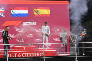 (250922) -- BAKU, 22 septiembre, 2025 (Xinhua) -- Imagen del 21 de septiembre de 2025 del ganador de la carrera, el piloto neerlandés de la escudería Red Bull, Max Verstappen (d), el ganador del segundo lugar, el piloto británico de la escudería Mercedes, George Russell (i) y el ganador del tercer lugar, el piloto español de la escudería Williams, Carlos Sainz (2-i), festejando durante la ceremonia de premiación al término de la carrera del Gran Premio de Azerbaiyán 2025 de Fórmula Uno, en Bakú, Azerbaiyán. (Xinhua/Tofik Babayev) (rtg) (ah) (vf)