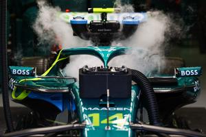 (250414) -- SAKHIR, 14 abril, 2025 (Xinhua) -- Imagen del 13 de abril de 2025 del monoplaza del piloto español de la escudería Aston Martin, Fernando Alonso, siendo enfriado con hielo seco previo al Gran Premio de Bahréin de Fórmula Uno, en el Circuito Internacional de Bahréin, en Sakhir, Bahréin. (Xinhua/Qian Jun) (rtg) (ah) (vf)