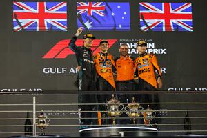 (250414) -- SAKHIR, 14 abril, 2025 (Xinhua) -- Imagen del 13 de abril de 2025 del piloto británico de la escudería Mercedes, George Russell (i), el piloto australiano de la escudería McLaren, Oscar Piastri (2-i), el director deportivo de la escudería McLaren, Andrea Stella (2-d) y el piloto británico de la escudería McLaren, Lando Norris, posando en el podio del Gran Premio de Bahréin de Fórmula Uno, en el Circuito Internacional de Bahréin, en Sakhir, Bahréin. (Xinhua/Qian Jun) (rtg) (ah) (vf)