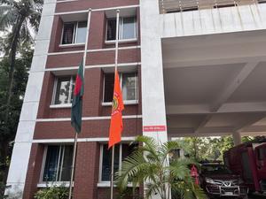 (250722) -- DHAKA, 22 julio, 2025 (Xinhua) -- Imagen del 22 de julio de 2025 de banderas arriadas a media asta afuera de una estación de bomberos y defensa civil, en Dhaka, Bangladesh. El número de muertos por el accidente del lunes de un avión de entrenamiento de la Fuerza Aérea de Bangladesh aumentó a 31 el martes, informó la división de relaciones públicas de las Fuerzas Armadas de Bangladesh en un comunicado. El Gobierno bangladeshí declaró un día de luto nacional el martes tras el accidente del avión. (Xinhua/Habibur Rahman) (jg) (ra) (vf)